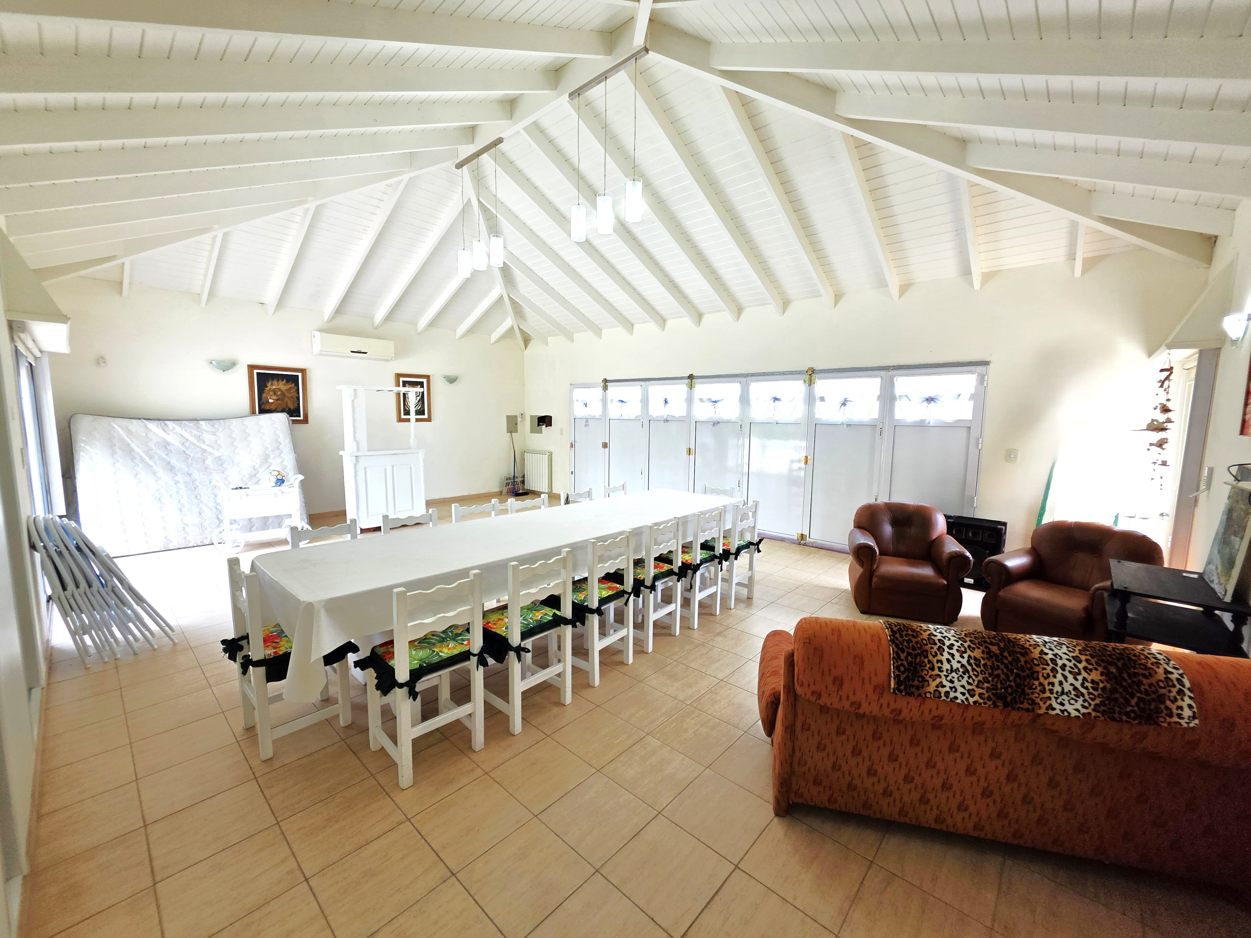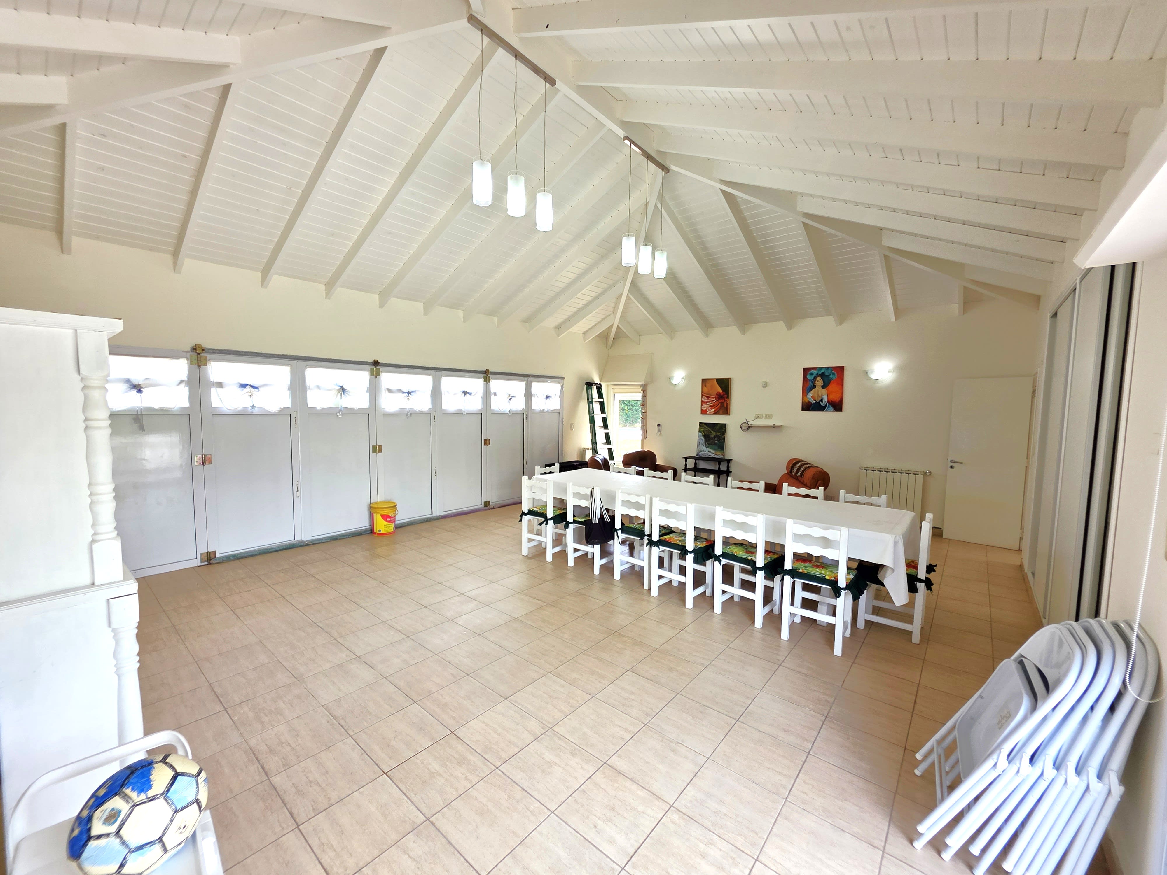 • Garaje / Segundo Salón: Un ambiente cubierto MUY amplio con portón, perfecto para cochera de dos autos o como un segundo salón de eventos con sus amoblamientos empotrados.